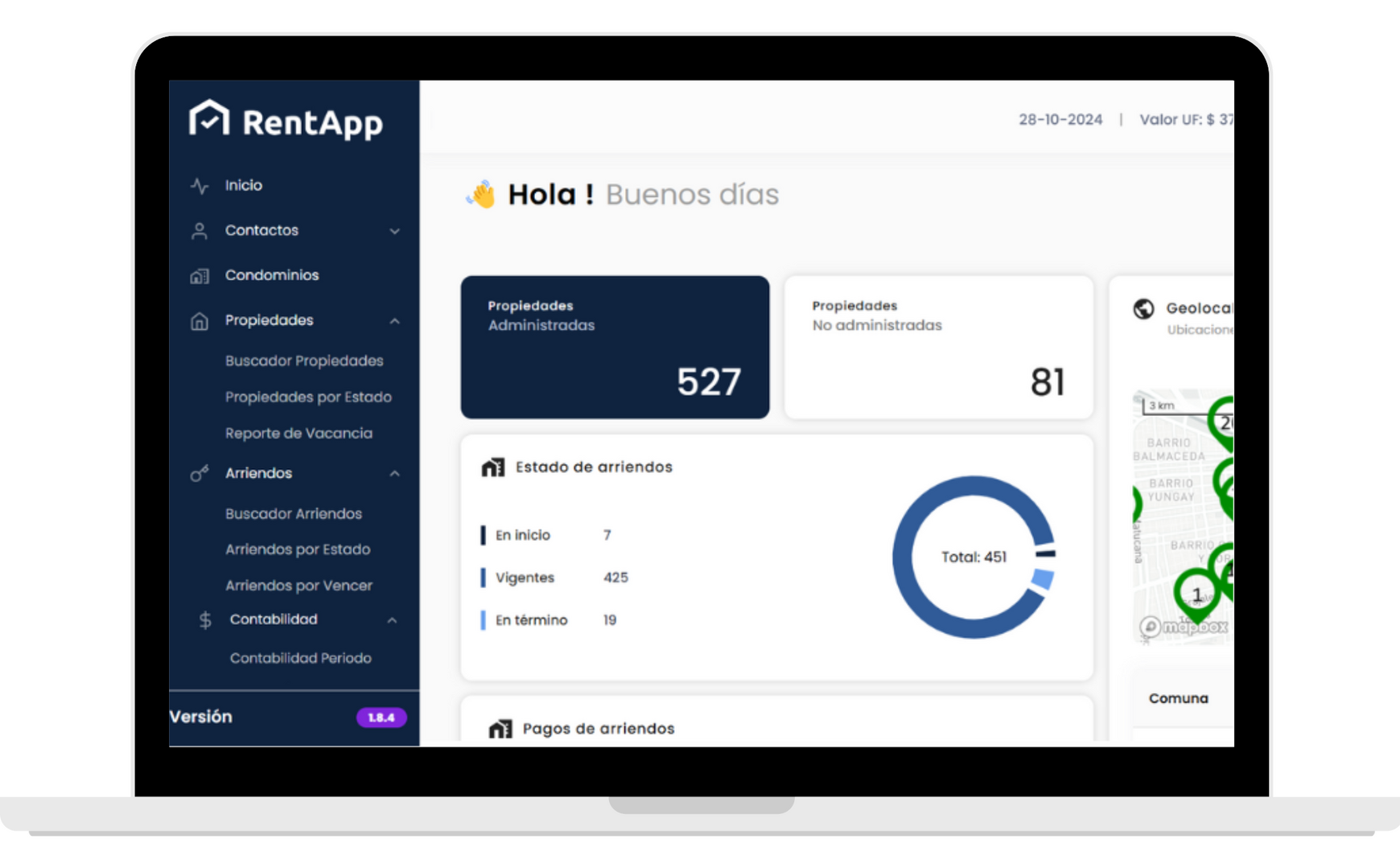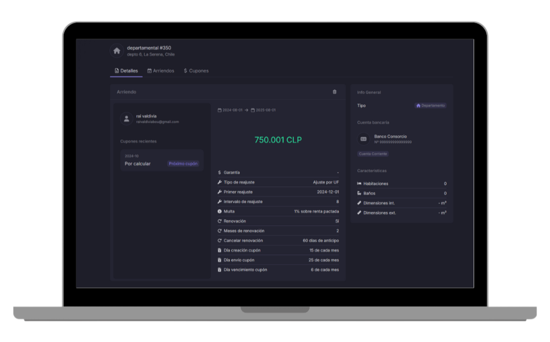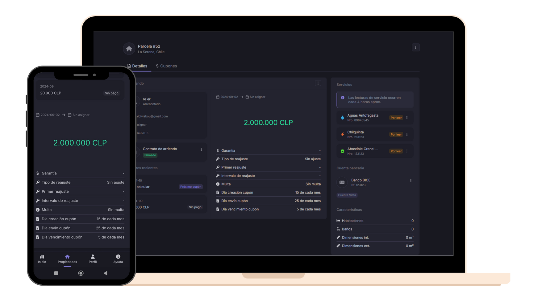 Administra tus propiedades fácil y rápido desde cualquier lugar. Calcula multas, ajusta arriendos y concilia pagos automáticamente, todo desde tu computadora en un solo lugar.
